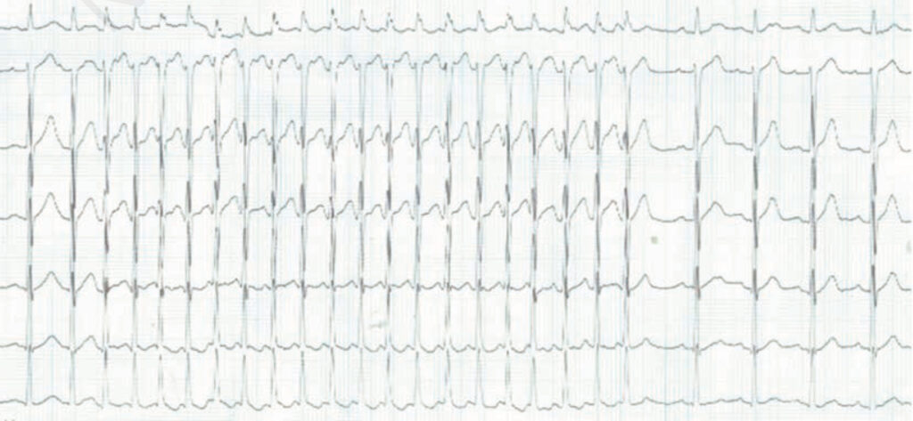 自動能亢進による頻拍では開始時と停止時に特徴があります。頻拍開始時に徐々に心拍数が上昇していく現象をwarm up現象、頻拍停止時に徐々に心拍数が低下していく現象をcool down現象と呼びます。これに対して、リエントリー性頻拍では突然頻拍が発症して心拍数が上昇してほぼ一定になり、突然停止して心拍数が低下します。