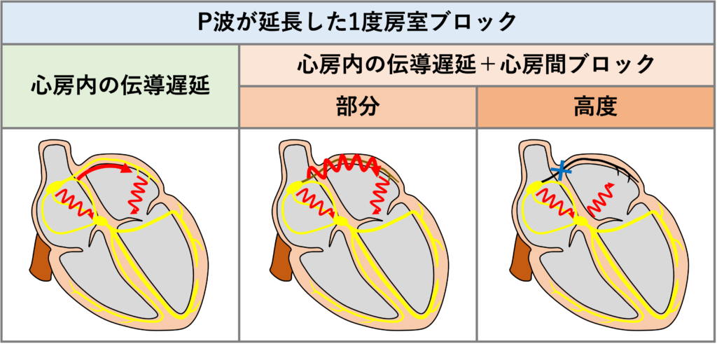 1度房室ブロックはそのほとんどが房室結節内の伝導遅延ですが、心房内の伝導遅延でも生じることがあり、その場合はP波が延長して幅が広くなります。