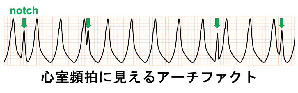 notch signとは心室頻拍のように見えるアーチファクトに基本調律のQRS波が埋もれており、QRS波のシャープな波形がnotchに見えるサインです。